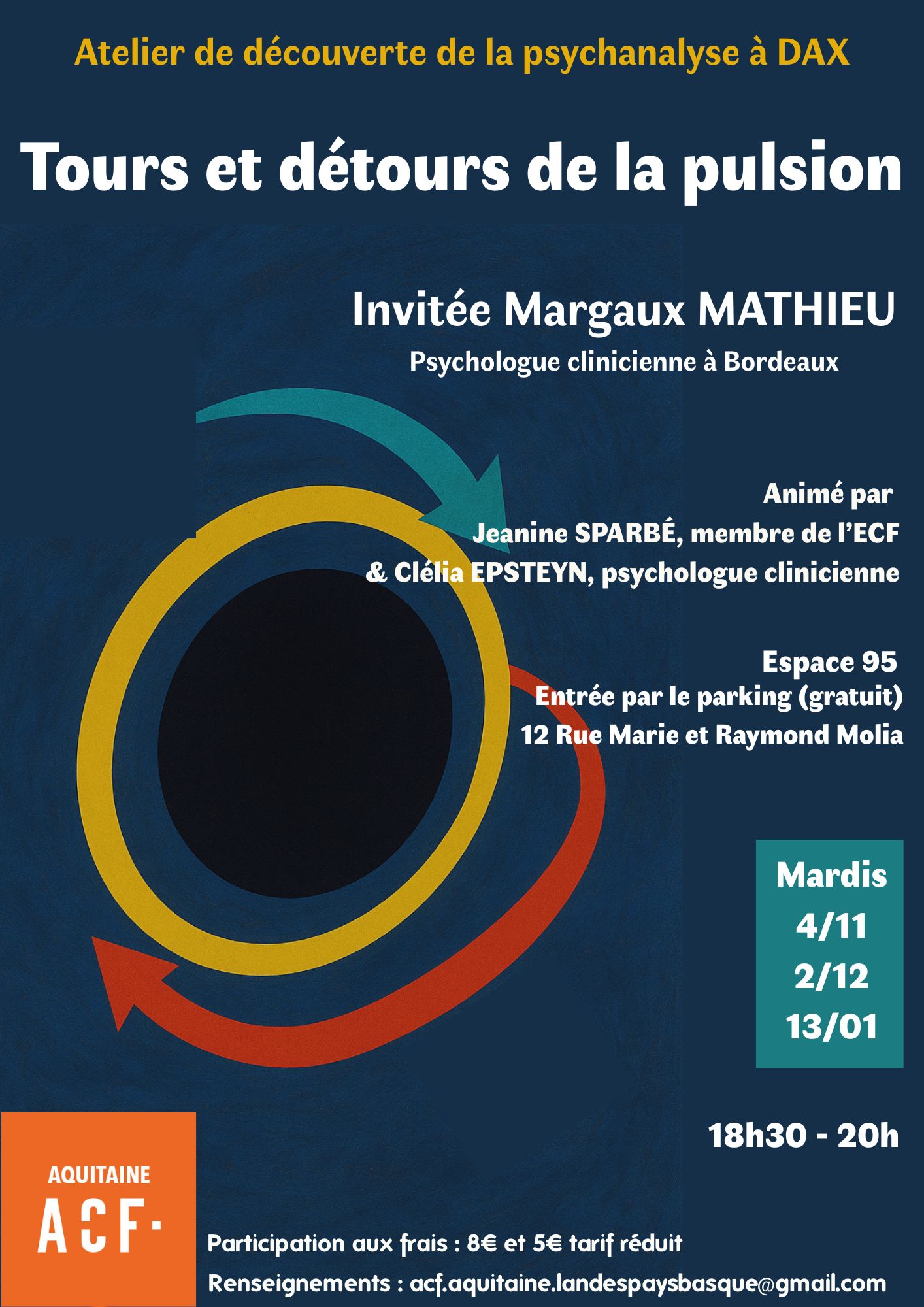 L’atelier “Découverte” consiste à étudier des textes fondateurs sur le concept de pulsion, concept défini par Sigmund Freud en 1915 dans sa “Métapsychologie” et repris par Jacques Lacan en 1963/1964 dans son séminaire XI “Les quatre concepts fondamentaux de la psychanalyse”.