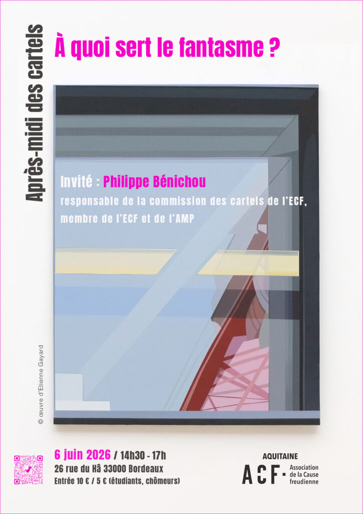 En janvier 2023, et Février 2024, deux séminaires de Jacques Lacan paraissent : « La logique du fantasme » (1966-1967), « L’acte psychanalytique » (1967‑1968). Des cartels se mettent au travail de les lire. Des produits en sont issus. Quatre vous seront proposés le 6 juin avec Annie Arnaud, Philippe Cousty, Thierry Lafossas et Julie Versapuech. Nous entendrons ainsi certaines étapes du parcours théorique de Lacan, dont chacun des cartellisants – à sa façon, avec ses mots – tentera de rendre compte.