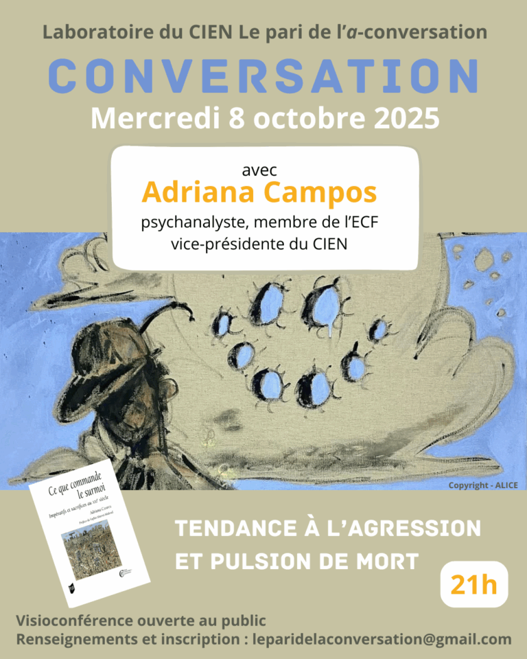 Mercredi 8 octobre à 21h, le laboratoire Le pari de l’a-conversation propose une conversation sur ce thème, « Tendance à l’agression et pulsion de mort », avec Adriana Campos, psychanalyste, membre de l’ECF, vice-présidente du CIEN.