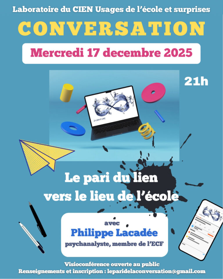 Le laboratoire « Usages de l’école et surprises » vous propose de participer à une conversation sur ce thème avec Philippe Lacadée, auteur de La vraie vie à l’école, le mercredi 17 décembre à 21h.