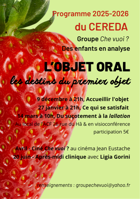 C’est au travers d’une lecture attentive, d’une clinique du détail, de la toute petite enfance — à partir du cas Nadia de Rosine Lefort, le samedi 14 mars — que le menu continuera de s’écrire, Du suçotement à la lallation.