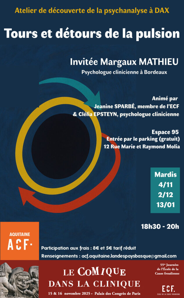 L’atelier s’adresse aux professionnels du champ médico-social et à toute personne qui s’intéresse à la psychanalyse. Les trois soirées d’études feront le tour de la pulsion “comme un concept frontière entre psychique et somatique, comme représentant psychique des stimulations issues de l’intérieur du corps et arrivant dans l’âme, comme une mesure de l’exigence de travail imposée au psychique en raison de sa connexion avec le corporel” (1) et le tour de ses quatre caractéristiques définies par S. Freud dans le texte Pulsions et destins des pulsions jusqu’au Démontage de la pulsion et à La pulsion partielle et son circuit par J. Lacan (2).