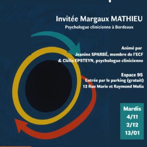 L’atelier “Découverte” consiste à étudier des textes fondateurs sur le concept de pulsion, concept défini par Sigmund Freud en 1915 dans sa “Métapsychologie” et repris par Jacques Lacan en 1963/1964 dans son séminaire XI “Les quatre concepts fondamentaux de la psychanalyse”. L’atelier s’adresse aux professionnels du champ médico-social et à toute personne qui s’intéresse à […]